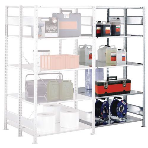 - Påbygningssektion: består af 4 stolper, 10 hylder og 4 forstærkninger. Tilbehør til Reol Easy-Fix dobbelt: Grundsektion.