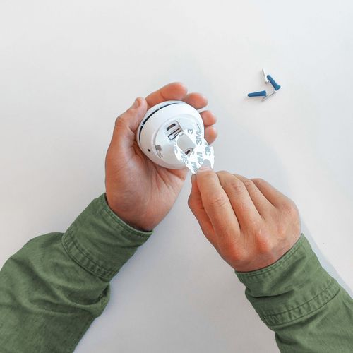 - Røgalarmen leveres med et 5-årsbatteri og kan monteres med medfølgende 3M-tape eller skruer.