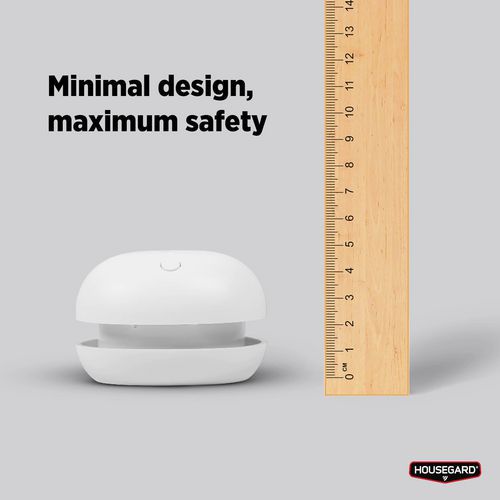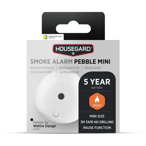 - Housegard Pebble Mini er en kompakt røgalarm (optisk detektionskammer) med en diameter på kun 67 mm, hvilket gør den diskret og nem at placere.