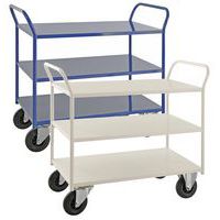 Helsvejsede rulleborde i den tunge serie – maksimal kapacitet på 400 kg fordelt på alle hylder. Pulverlakeret i hvid eller blå. Rullebordene fås i to forskellige bredder, 450 og 550 mm. Vælg mellem 2, 3 eller 5 hylder samt høj eller lav model. Fire hjul, to faste og to drejehjul. Fremstillet i EU Kapacitet (kg) : 400