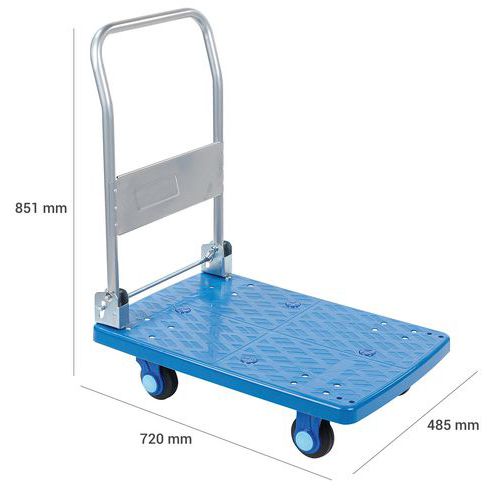 | Varenavn | Rullevogn af plast, fældbart håndtag 200 kg, Kapacitet: 200 kg, Totalhøjde: 851 mm, Totalbredde: 485 mm |