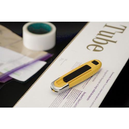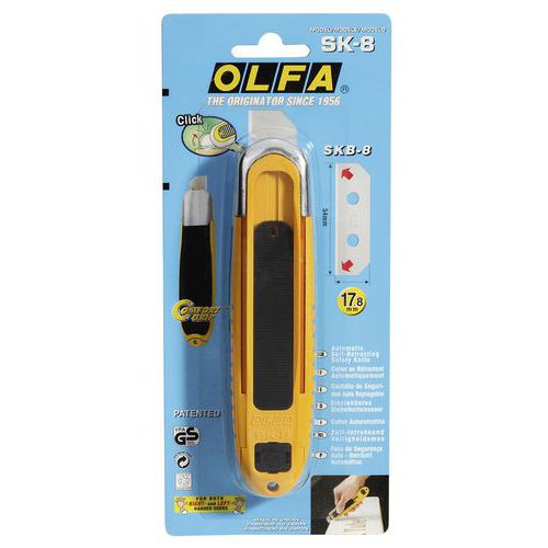 | Varenavn | Sikkerhedenkniv Olfa SK8, Indtrækkeligt blad: ja, Farve: Gul, Køkken: nej, Hus, materiale: Plast, Blad |