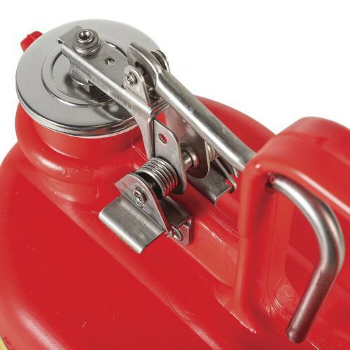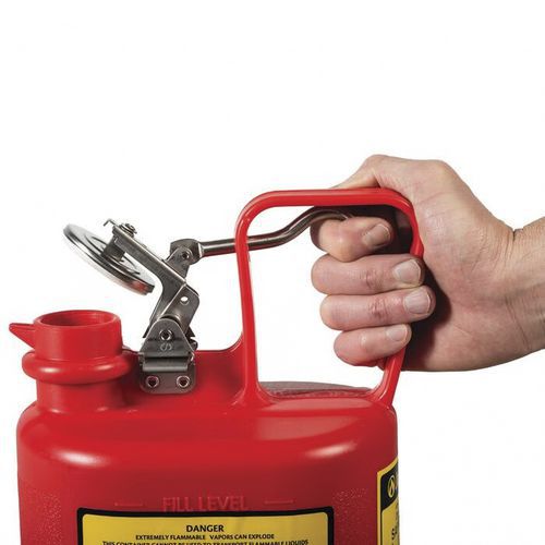 Den indbyggede ledende kulstofindsats sidder på kanten af beholderen og skaber en jordforbindelse mellem låget og flammeskærmen for god jording og forhindrer statisk elektricitet i at opbygge sig under tømning og genopfyldning.