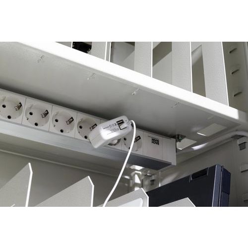Skabene er udstyret med 240 V-stik til opladning af enheder og er jordet samt CE-mærket for sikker drift.