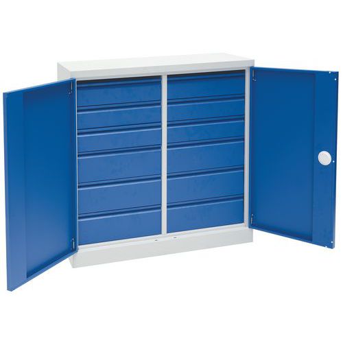 Robust, lavt værkstedsskab til tunge materialer og værktøjer.