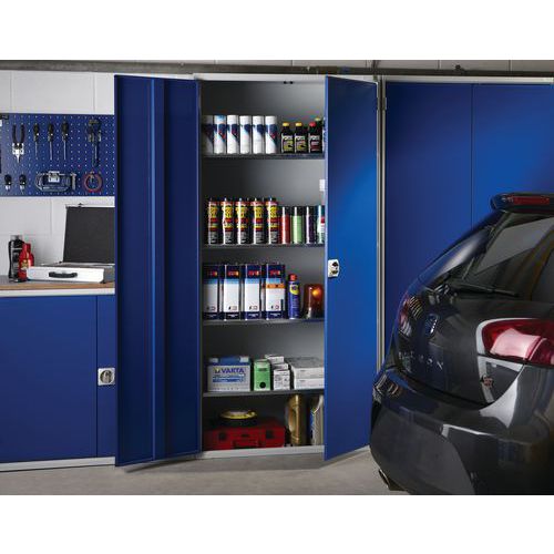 Svejset stålpladekonstruktion. Forstærkede døre med 3-punkts lås. Ventilerede døre for god ventilation og udsyn til indholdet. Fremstillet i Storbritannien Maksimal last (kg) : 1000 Maksimal vægt pr. hylde (kg) : 75