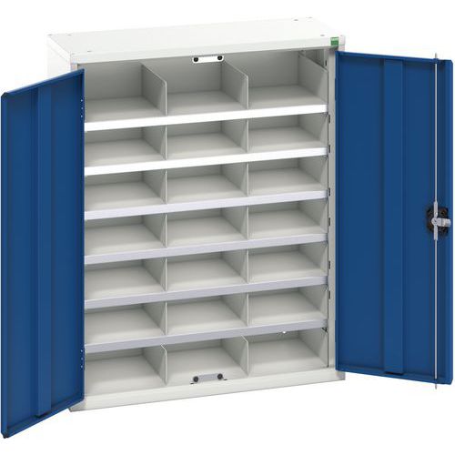 Låsbart skab i stålplade med rum. Ideelt til post, dokumentopbevaring, lagerbygninger osv. Rum med mål LxBxH 235x310x100 mm. Forstærkede døre, 3-punktslås med rigel. Belastningsevne 60 kg pr. hylde. Fremstillet i Storbritannien Maksimal last (kg) : 1000 Maksimal vægt pr. hylde (kg) : 75