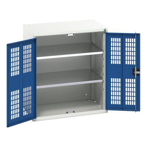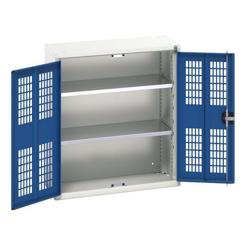 Svejset stålpladekonstruktion. Forstærkede døre med 3-punkts lås. Ventilerede døre for god ventilation og overblik over indholdet. Hylder i galvaniseret stål, justerbare i trin af 25 mm. Belastningsevne pr. hylde 60 kg. Sikkerhedsråd: - installer møblet på en plan overflade - fastgør det til en væg eller skillevæg med egnede beslag - sørg for ikke at overskride den maksimalt anbefalede belastning, og sørg for, at den er godt fordelt. Fremstillet i Storbritannien Maksimal last (kg) : 1000 Maksimal vægt pr. hylde (kg) : 75