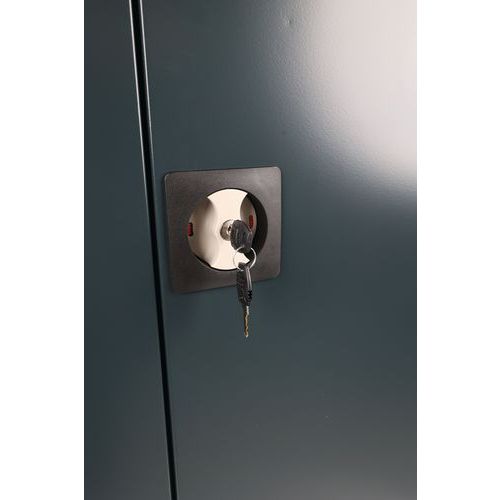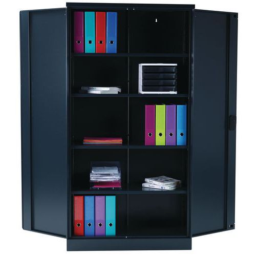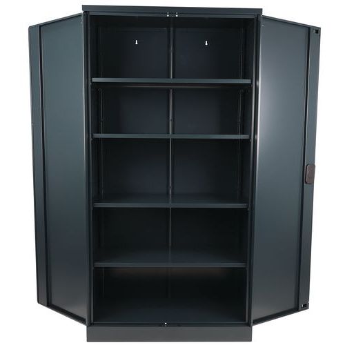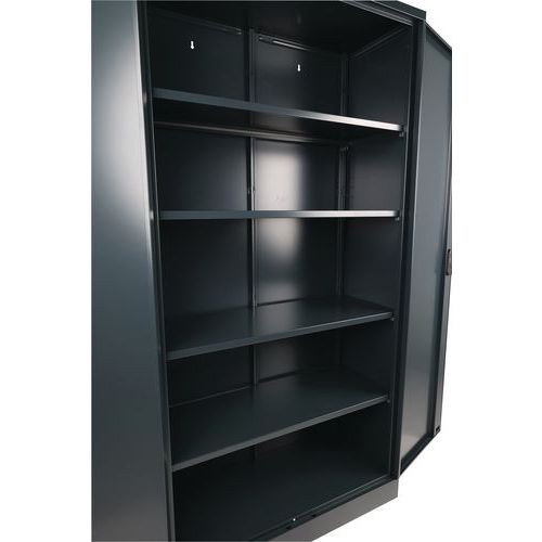 Nyd stillegående låger med lyddæmper. Opbevaringsskabet med hængslede låger kan låses ved hjælp af håndtaget med indbygget lås. Sikkert skab takket være paskvil med trepunktslås. Skabet med hængslede låger er nemt at samle uden brug af værktøj. Skabet leveres umonteret for bedre transportøkonomi. Leveres med 4 hylder, monteringsvejledning og 2 nøgler. Garanti : 10 år Maksimal vægt pr. hylde (kg) : 60 Montering : Skal samles