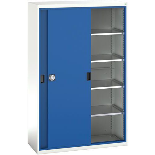 Verso garderobeskab med skydedøre. Med 4 hylder. 1300x550x2000. Skabet låses med nøgle. Lavet i UK Maksimal vægt pr. hylde (kg) : 75 Maksimal last (kg) : 1000