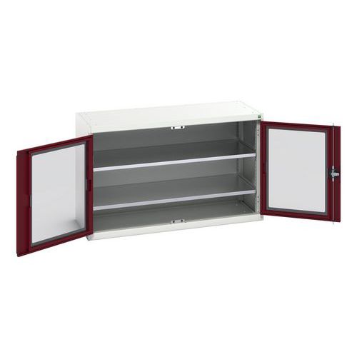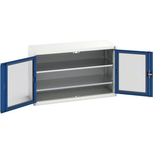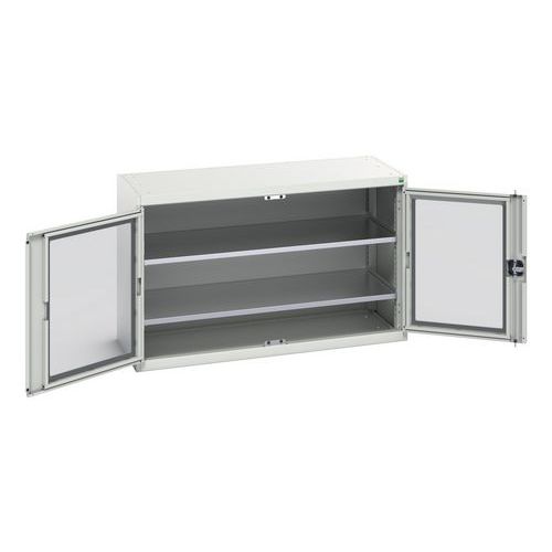 Verso skab med transparente døre. Med 2 hylder. LxBxH: 1300x550x800mm. RAL 7035. Fremstillet i Storbritannien Maksimal vægt pr. hylde (kg) : 75 Maksimal last (kg) : 1000