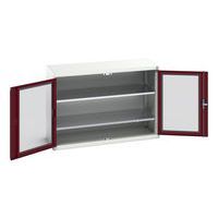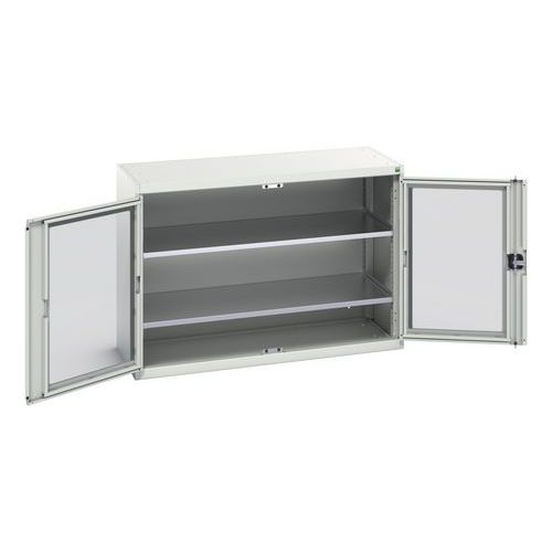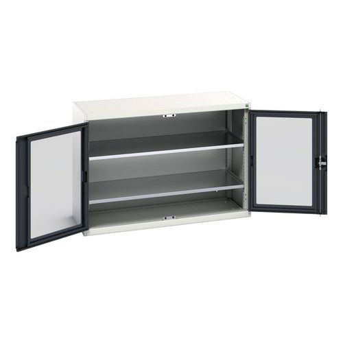 Verso skab med transparente døre. Med 2 hylder. 1300x550x900. Fremstillet i Storbritannien Maksimal vægt pr. hylde (kg) : 75 Maksimal last (kg) : 1000