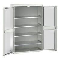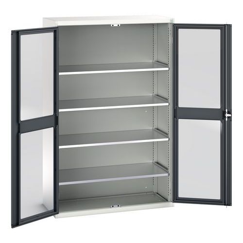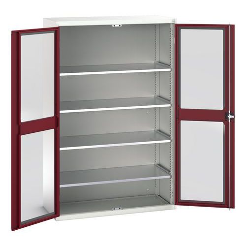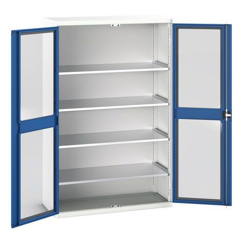 Verso skab med transparente døre. Med 4 hylder. 1300x550x2000. Fremstillet i Storbritannien Maksimal last (kg) : 1000 Maksimal vægt pr. hylde (kg) : 75