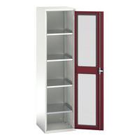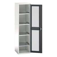 Verso skab med transparente døre. Med 4 hylder. 525x550x2000. Fremstillet i Storbritannien Maksimal vægt pr. hylde (kg) : 75 Maksimal last (kg) : 1000