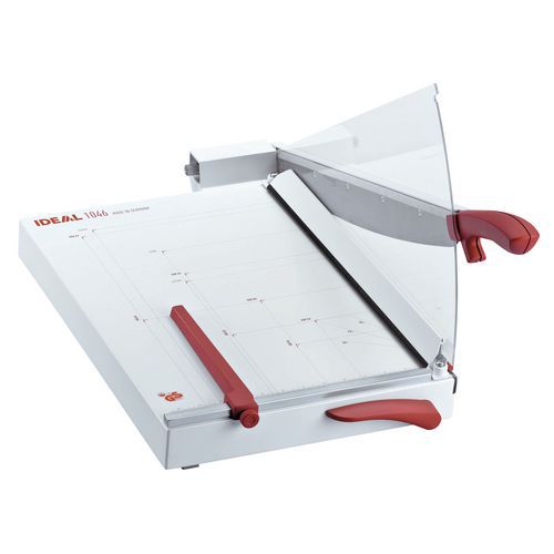 - Den manuelle papirholder sikrer papiret, og det ergonomiske håndtag giver behagelig og præcis skæring.
