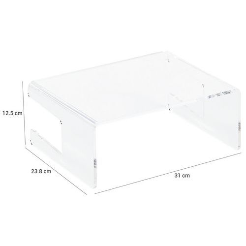 | Varenavn | Skærmstativ i akryl , Maksimal last: 8 kg, Farve: Transparent, Totalhøjde: 12.5 cm, Totalbredde: 31 cm |