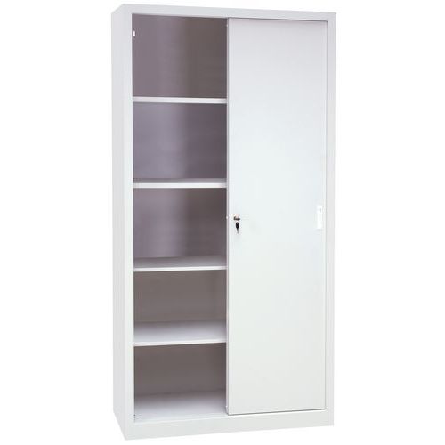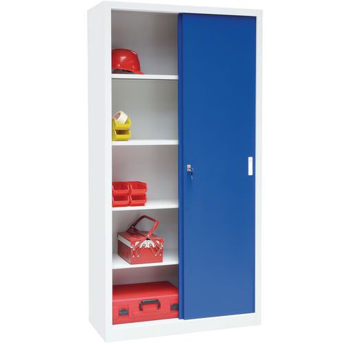 Højt, robust værkstedsskab i 0,9 mm tykt stål. Med dobbelte skydedøre, som sparer plads. Hyldernes højde kan nemt justeres. Let at lukke ved hjælp af låsen.