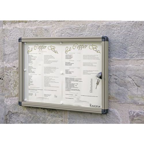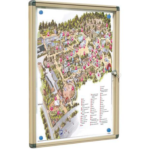 - Skilteskab til udendørs brug med magnetisk bund. Ramme i aluminium samt hjørner i polykarbonat. Dør med plexiglas. Leveres med 2 nøgler.
