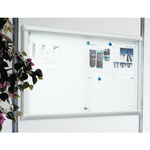 - Ramme i anodiseret aluminium. Skilteskab til indendørs brug med skydelåger i sikkerhedsglas med en tykkelse på 4 mm og cylinderlås.