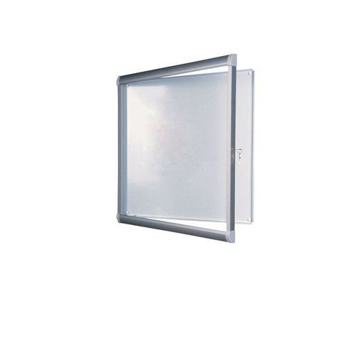 Ramme i natureloxeret aluminium med rundede hjørner i ABS-plast. Dør med 3 mm plexiglas. Whiteboard (hvidemaljeret stålbund). Skruesæt til ophæng medfølger.