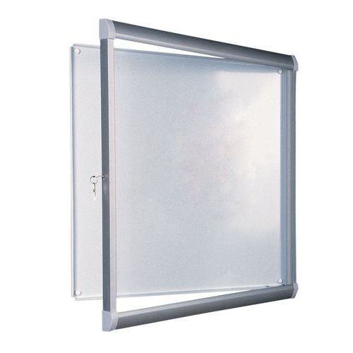 Ramme i natureloxeret aluminium med rundede hjørner i ABS-plast. Dør med 3 mm plexiglas. Whiteboard (hvidemaljeret stålbund). Skruesæt til ophæng medfølger.