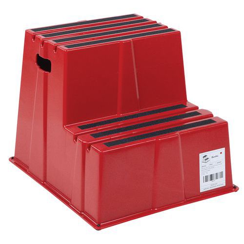 Enkel, behagelig trappestige..Skridsikre, brede trinoversider..Sikre, ru strimler..Let at gribe fat i takket være håndtagene..Enkelt enhed, høj stabilitet..Alle Manutan-produkter er testet og godkendt af vores teams. Skridsikker gummipude placeret under hvert hjørne af trinnet. Garanti : 10 år Maksimal last (kg) : 230
