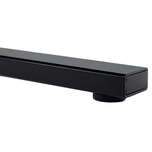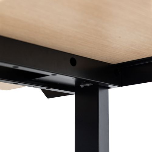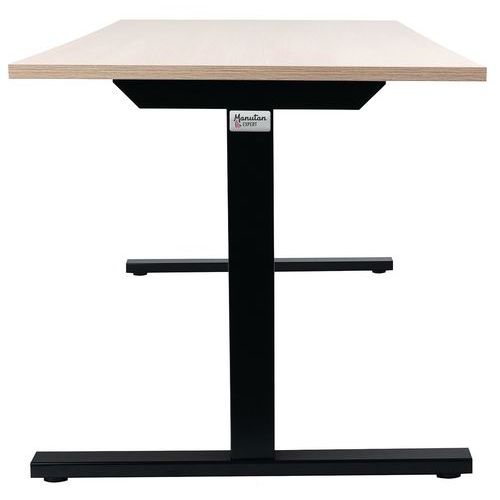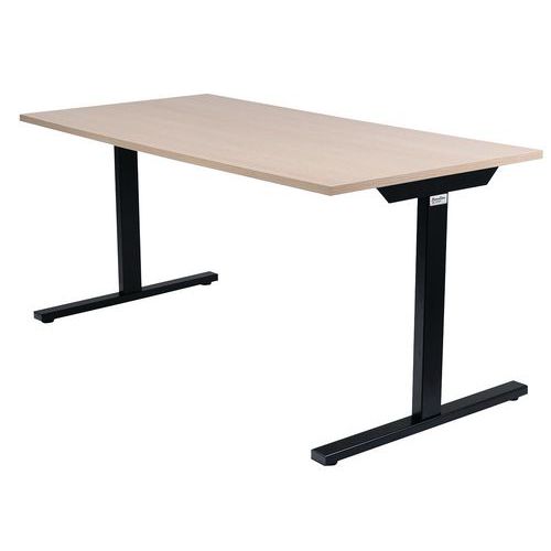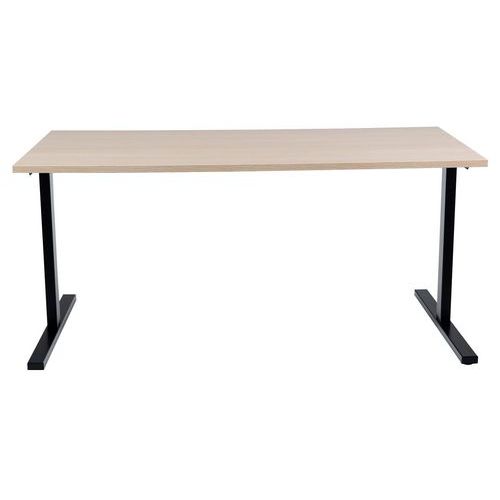 Lige skrivebord med T-formede ben. Melaminbordpladen er 25 mm tyk med en 2 mm ABS-kant. Metalben 796x6x3 mm.