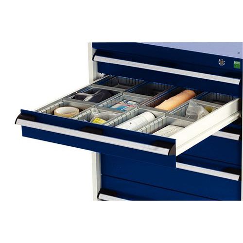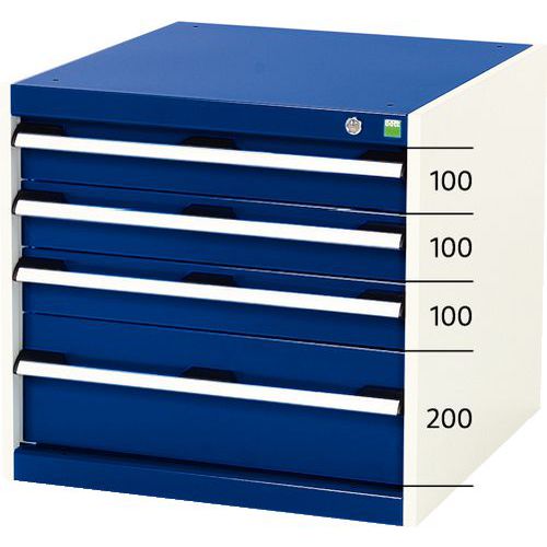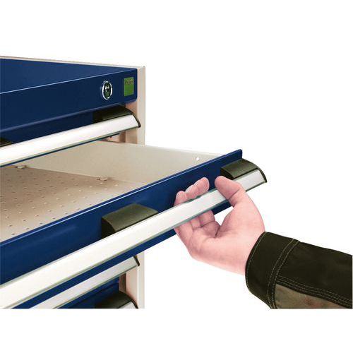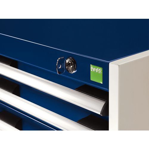 Skuffer kan justeres i højden i trin af 25 mm. Skuffer åbner 100%: fuld adgang til indholdet. Centrallås med nøgle. Skuffer monteret på kuglelejer.