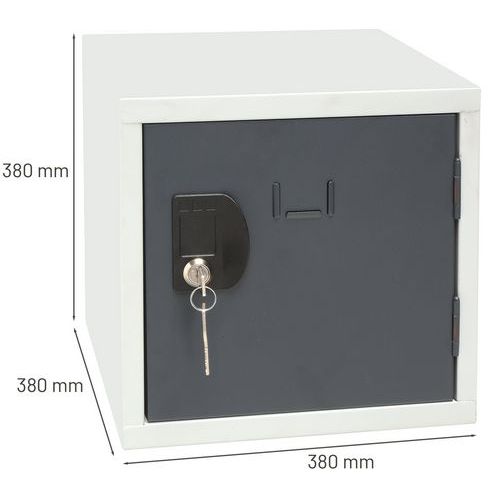 Terningformet opbevaringsskab med forborede huller. 180° åbning med skjulte hængsler. Med cylinderlås. Leveres med etiketholder og 1 sæt med 2 nøgler.