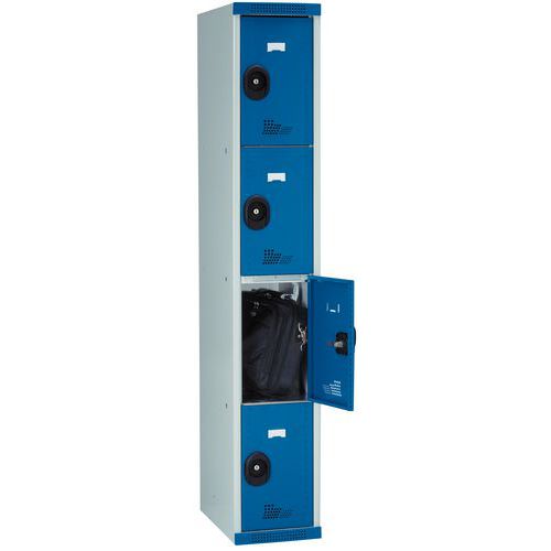 Indbrudssikret: bagkantssikrede låger og forstærket konstruktion. 120⁰ åbning. Ingen adgangsmulighed mellem øverste og nederste rum. Fire monteringshuller til montering af flere skabe på række. Hygiejne: ventilationsåbninger foroven og forneden på lågerne samt i skabets bund. Klædeskab med etiketholder.