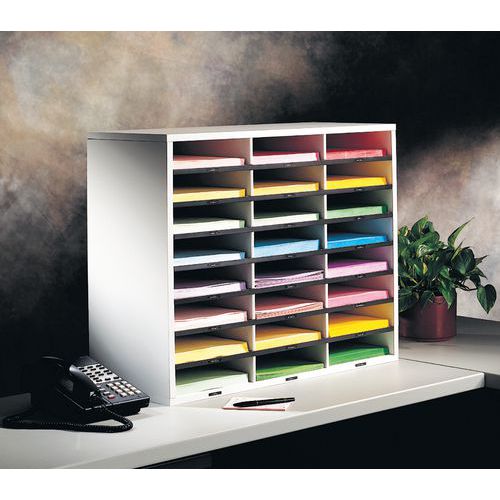| Varenavn | Sorteringsreol med 24 rum, grå, Materiale: Spånplade, Farve: Lysegrå, Totalbredde: 73.7 cm |