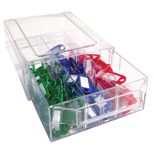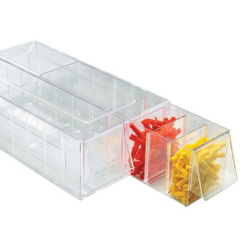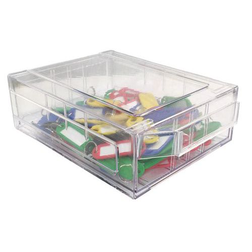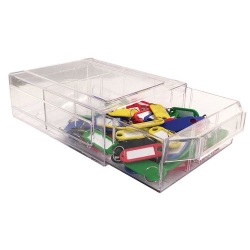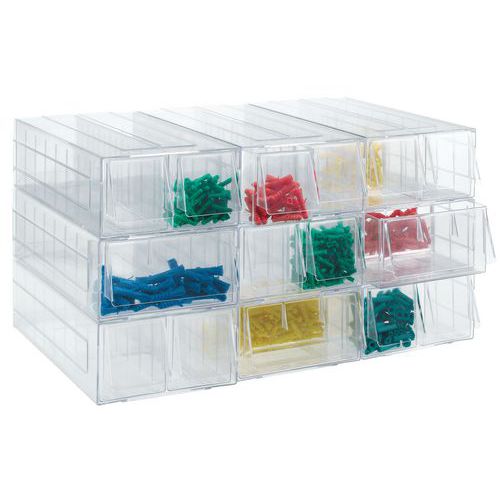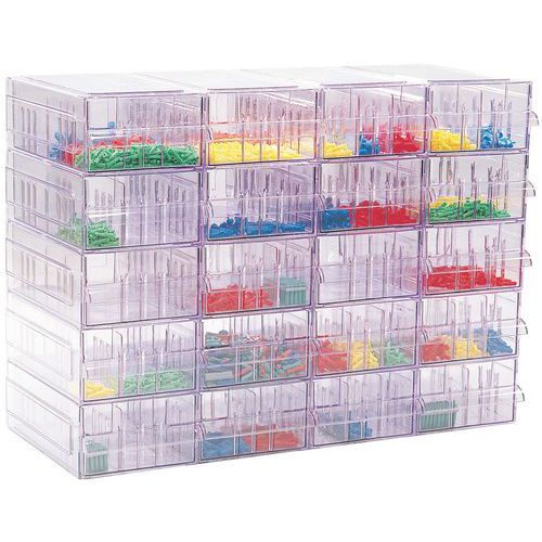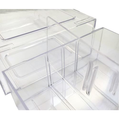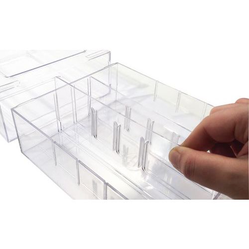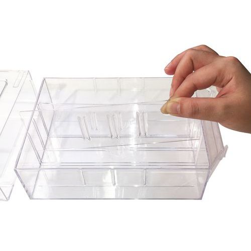 100 % transparent, hvilket giver et fuldstændigt overblik. Sortimentskasser, som kan monteres oven på eller ved siden af hinanden. Kræver ingen særlige beslag takket være det patenterede monteringssystem. Håndtag med indbygget etiketholder.