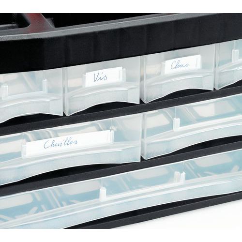 - Placer opdelerne efter behov, og få orden på tingene. Transparente skuffer med etiketholdere.