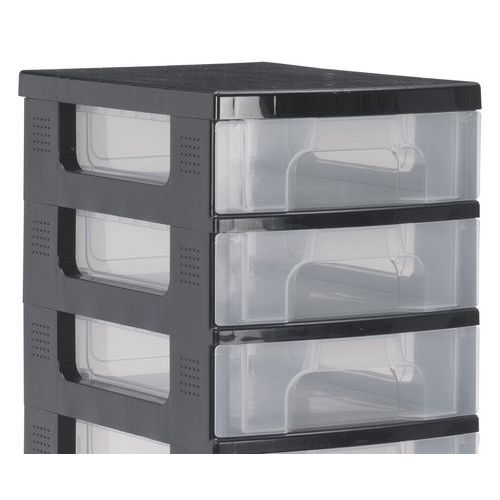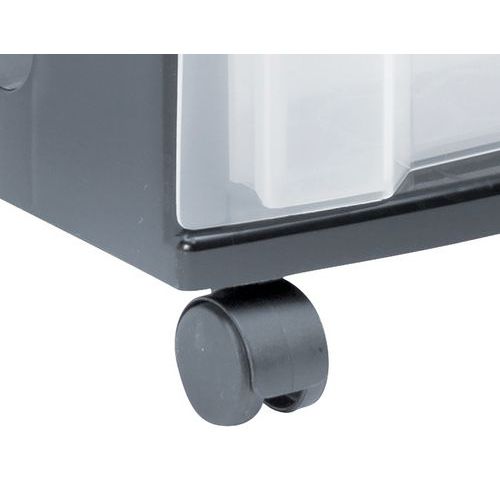 Skuffesektion på 4 hjul, som er meget let at håndtere. Transparente kasser, som giver et bedre overblik over indholdet, og tæt konstruktion, som beskytter mod støv. Perlemorsfarvede overflader på siderne til nem mærkning.