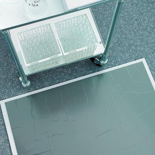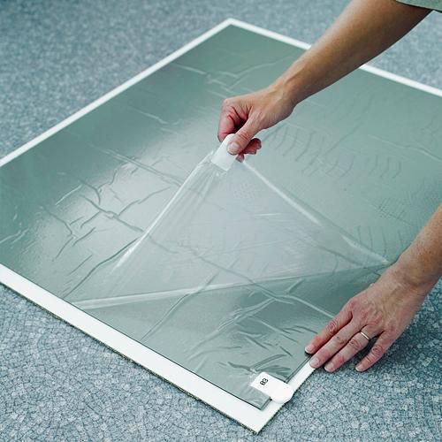 Klæbemåtten består af en skridsikker hvid bundplade af vinyl med 60 klæbende ark, der opsamler støv og smuds fra skoene.
