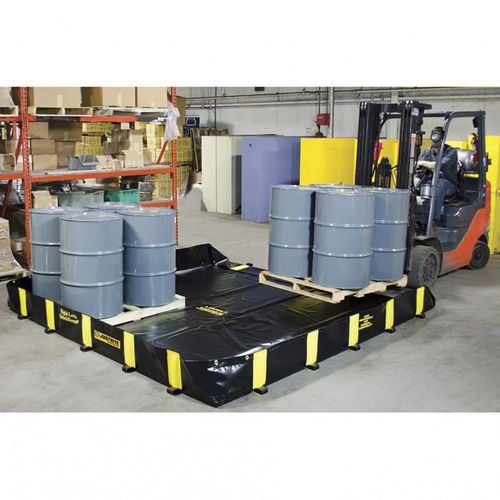 Holdbar og fleksibel spildpool med ergonomisk design, der giver adgang til indersiden af spildtanken, med fri plads fra den ene side til den anden til køretøjsdæk, personale og til rengøring. Væggene har indbyggede rustfri stålskinner, der låser sidevæggene i en 305 mm høj og 90 graders lodret position. Presenningen er kemisk resistent og modstandsdygtig over for UV-eksponering, perfekt til udendørs brug. Hurtig og øjeblikkelig implementering? ingen montering nødvendig. Integrerede huller til forankring af spilddugen.