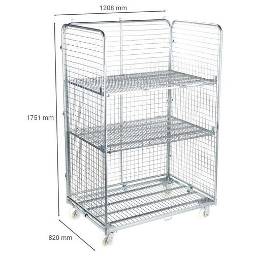 | Varenavn | Rullecontainer tresidet, Kapacitet: 600 kg, Totalhøjde: 1751 mm, Totallængde: 1208 mm, Antal sider: 3 |