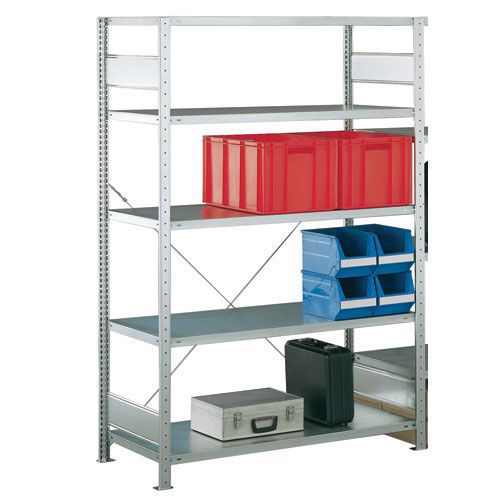 Grundsektion: består af 4 stolper - koblinger - stolpefødder - 1 tværstiver - 5 eller 6 hylder. Meget let at montere uden værktøj. Ideel til opbevaring af varer med stor volumen. Hylderne kan indstilles i højden i intervaller af 25 mm. Fås i 2 højder og 5 dybder. Forzinket storfagsreol.