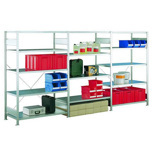 - Påbygningssektion: består af 2 stolper - koblinger - stolpefødder - 1 tværstiver - 5 eller 6 hylder. Forzinket storfagsreol. Tilbehør til Storfagsreol Easy-Fix: Grundsektion.