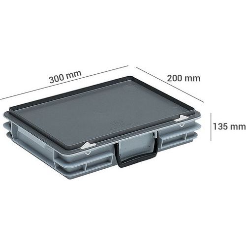 | Varenavn | Transportkasse mappe 5 l, 300 mm, Volumen: 5 L, Totalhøjde: 135 mm, Totalbredde: 200 mm, Totallængde: 300 mm |