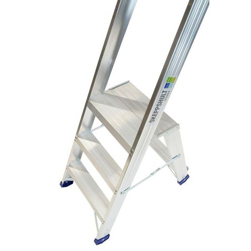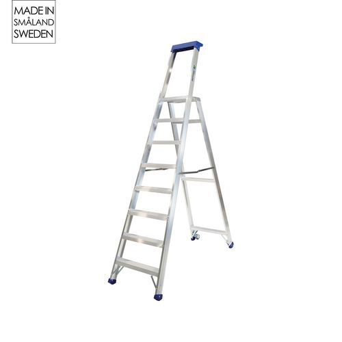 Trappestige 3350 - en robust trappestige fremstillet i aluminium, perfekt til krævende arbejdsmiljøer. Stigen har hydraulenittede trin og en stabil platform for ekstra sikkerhed. Den er udstyret med en plastværktøjshylde og plastfødder for skridsikring og beskyttelse af underlaget. Modellen har hjul på de bagerste ben for nem transport. Tilbehør som stigeforlængere og håndlister er tilgængelige, og alle stiger er godkendt i henhold til AFS 2004:3 og EN-131. Trappestige 3350 med 3-, 4- og 5-trin opfylder kravene i Bra arbejdsmiljøvalg. Hvad indebærer Bra arbejdsmiljøvalg? Bra arbejdsmiljøvalg er et certifikat, udarbejdet af Riksbyggarnas sikkerhedsgruppe i Sverige, for at skabe sikrere stigeprodukter, der opfylder en højt stillet kravspecifikation. Maksimal last (kg) : 150
