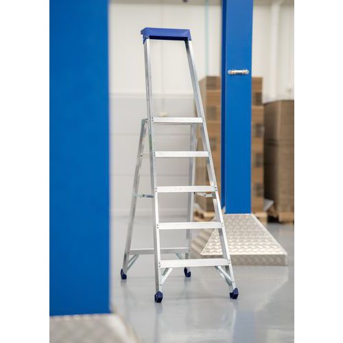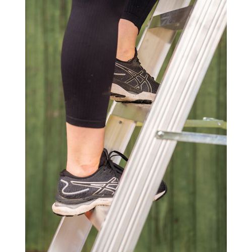 Trappestige 5050 er udstyret med plastfødder, der giver fremragende skridsikring og skåner underlaget, samt en praktisk værktøjshylde i plast.