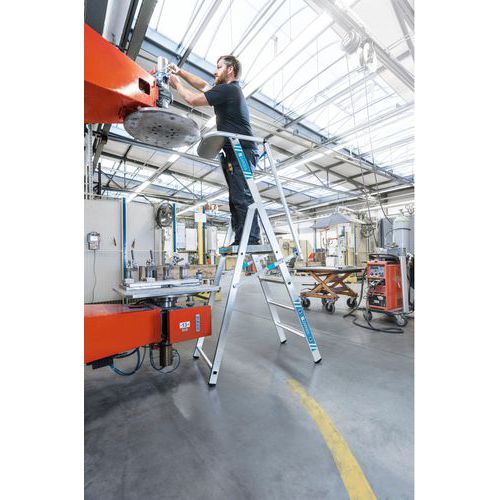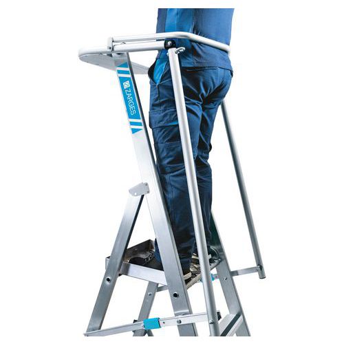 Platformstige ZAP Safemaster S - Sikker op- og nedstigning og høj sikkerhed takket være 80 mm skridsikre trin med Zarges Safer Step-teknologi samt eloxerede håndtag og 1 meter høje sikkerhedsrækværker.