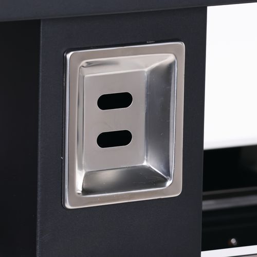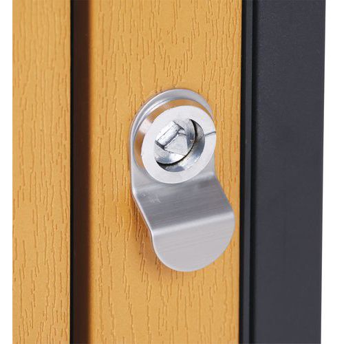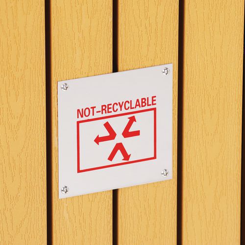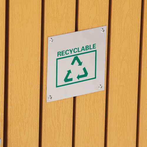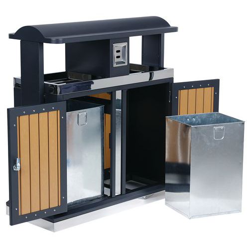 Selektiv sorteringsbeholder med låg. Leveres med et askebæger og 2 beholdere (2x5 liter). Plastimiterede trælameller dækker den pulverlakerede stålramme. Låsbare rum. Designet til montering på gulvet.