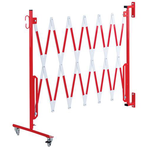 Udvidelig stålbarriere på hjul og vægmontering for midlertidig afgrænsning. Tofarvede striber for øget synlighed. Kun egnet til indendørs brug. Nem at håndtere, opbevare og bruge takket være dens hjul med bremser. TÜV certifikat.