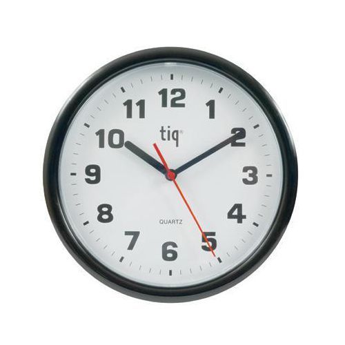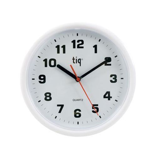 - Enkelt vægur i plast med tydelige tal, sorte tal og hvid urskive.