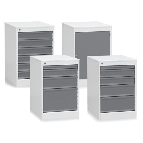Skufferne er fremstillet i bukket stålplade og har integreret greb, mens skabskonstruktionen er forsynet med centrallås, der låser alle skuffer samtidig.