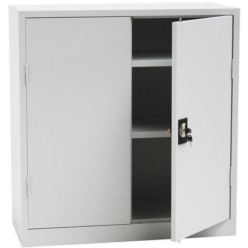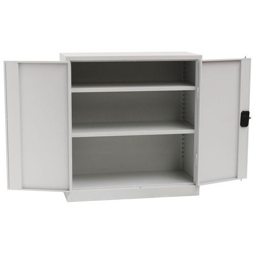 - Skab i stål med hængslede låger. Hyldernes højde kan nemt justeres i trin på 36 mm. Skabet leveres samlet.