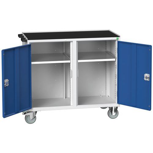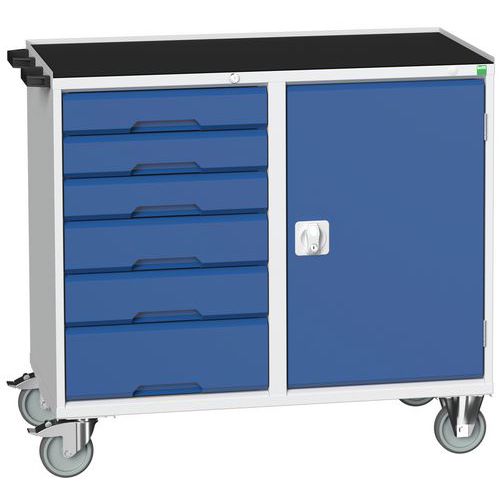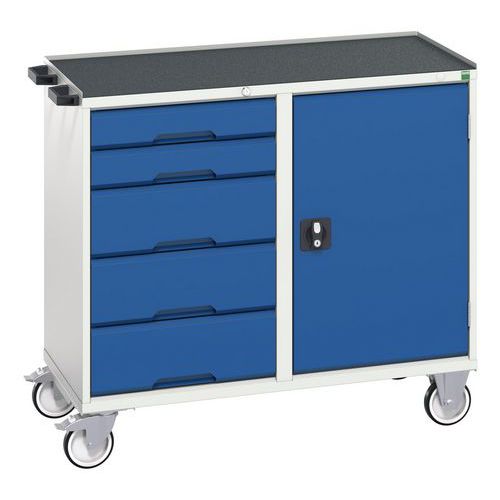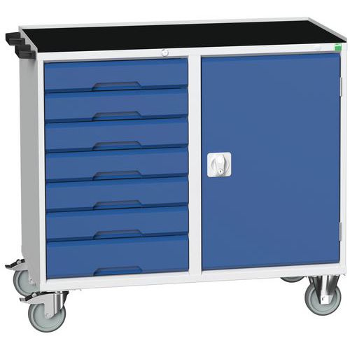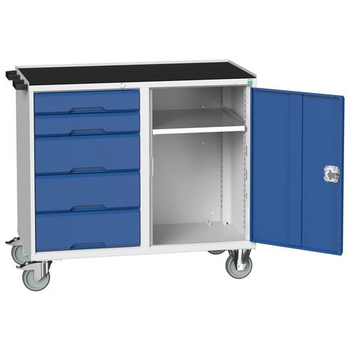 Konstruktion af svejset stålplade. Dørrummet er udstyret med en højdejusterbar hylde i galvaniseret stål. Belastning pr. hylde 60 kg. Skuffer åbner 100%, belastning 50 kg. Sikkerhedsmekanisme, der forhindrer utilsigtet åbning af skuffer. Håndtag 4 hjul diameter 125 mm, 2 faste og 2 drejelige med bremse. Maksimal tilladt belastning 200 kg. Bredde 1050 mm. Højde 980 mm, dybde 600 mm med 30 mm tyk top. Højde 965 mm, dybde 550 mm med 3-sidet top.