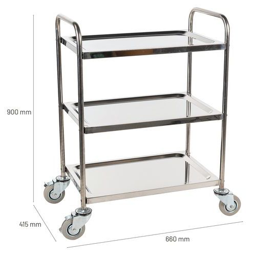 | Varenavn | Vogn i rustfrit stål, Kapacitet: 100 kg, Totalhøjde: 900 mm, Totalbredde: 415 mm, Totallængde: 660 mm |